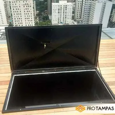 Fabricada em Alumínio Naval Xadrez, que é a melhor liga do mercado, a tampa alçapão alumínio é instalada para proteger o acesso à laje e telhado, que tanto podem estar localizadas em residências e condomínios, quanto podem ser/estar instaladas em escolas, industrias e comércios em geral. Fabricada sob medida para atender a necessidade de cada cliente, a tampa alçapão alumínio não enferruja e se caracteriza em função da alta resistência que lhe é inerente, além de permitir uma abertura de 180º. Não bastasse, o metal (alumínio) que confere base a este tipo de tampa se destaca por ser considerado um material nobre, fazendo com que a água potável que normalmente fica armazenada no interior destes tanques não seja contaminada em simplesmente nenhum aspecto.