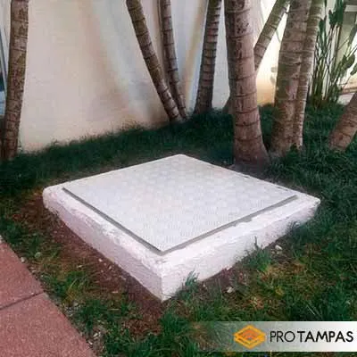 A tampa permite abertura de 180º e segurança durante as manutenções periódicas, por ser acompanhada com um feixe em alumínio para cadeado com 20 milímetros de dimensão, Além disso, as tampas podem ser fabricadas em diversos modelos: as vincadas, que possuem bico diamante, evitando o acúmulo de água sobre a tampa, o que impede que doenças como a dengue, Chikungunya e Zika Vírus e as reforçadas, que normalmente ficam niveladas ao chão, apropriadas para locais com tráfego de pedestres e veículos.